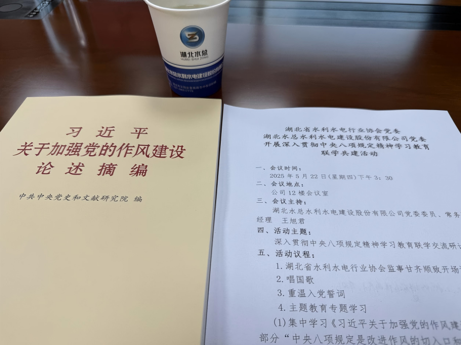 为深入贯彻落实中央八项规定精神,强化作风建设,2025年5月22日下午,湖北省水利水电行业协会党委副书记、秘书长李洪兵、监事甘齐顺以及主任李文芳一行莅临湖北水总开展深入贯彻中央八项规定精神学习教育联学共建活动。湖北水总公司党委书记、董事长李红辉,党委副书记、总经理甘维忠,党委委员、常务副总经理王旭君参加。